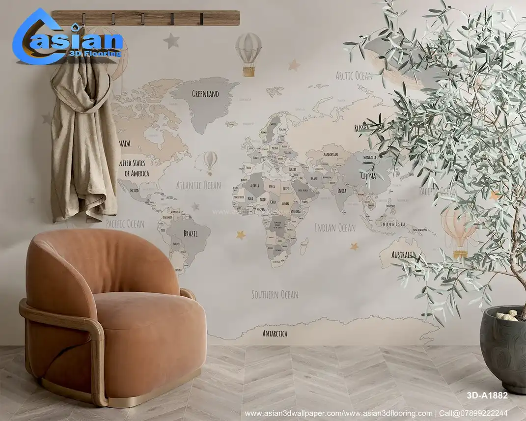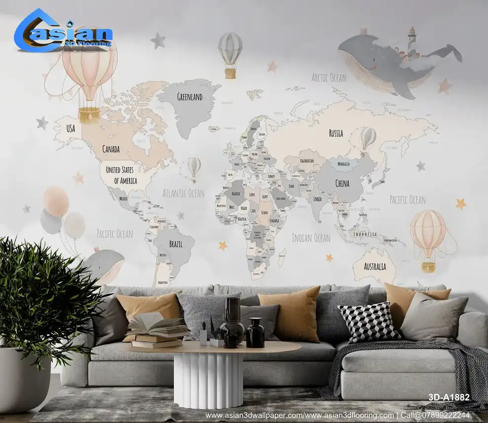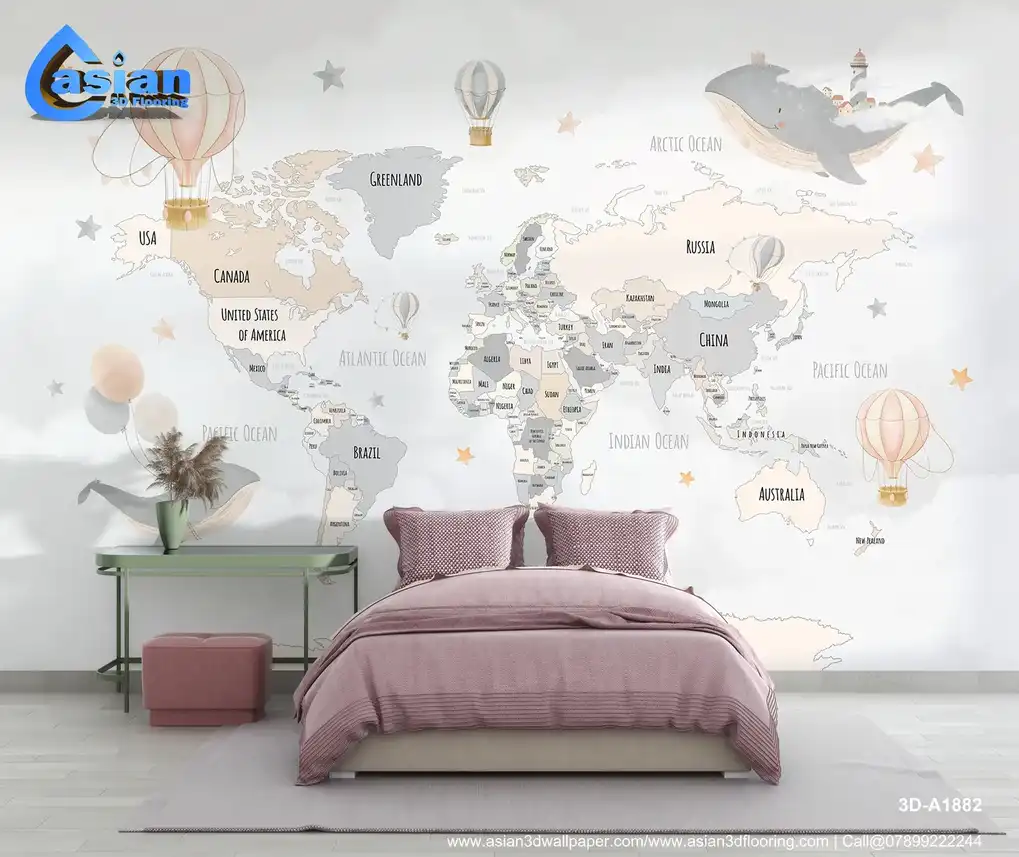 Whimsical World Map for Kids' Rooms with Hot Air Balloons and Whale||3D-A1882