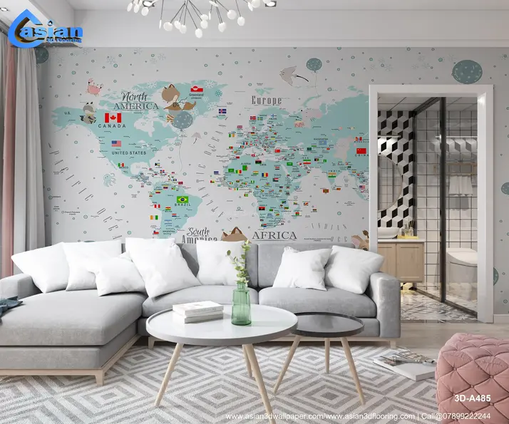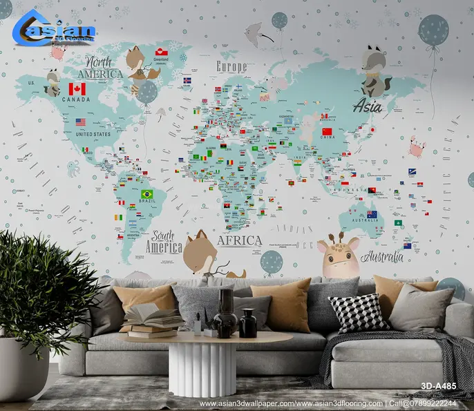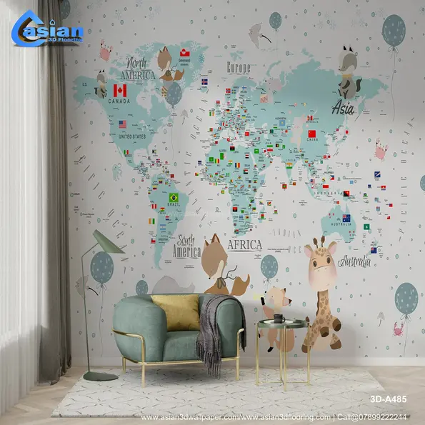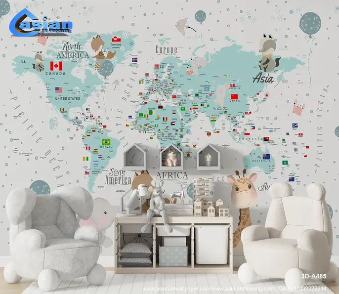 World Map Kids Wallpaper with Cute Animal Illustrations||3D - A485