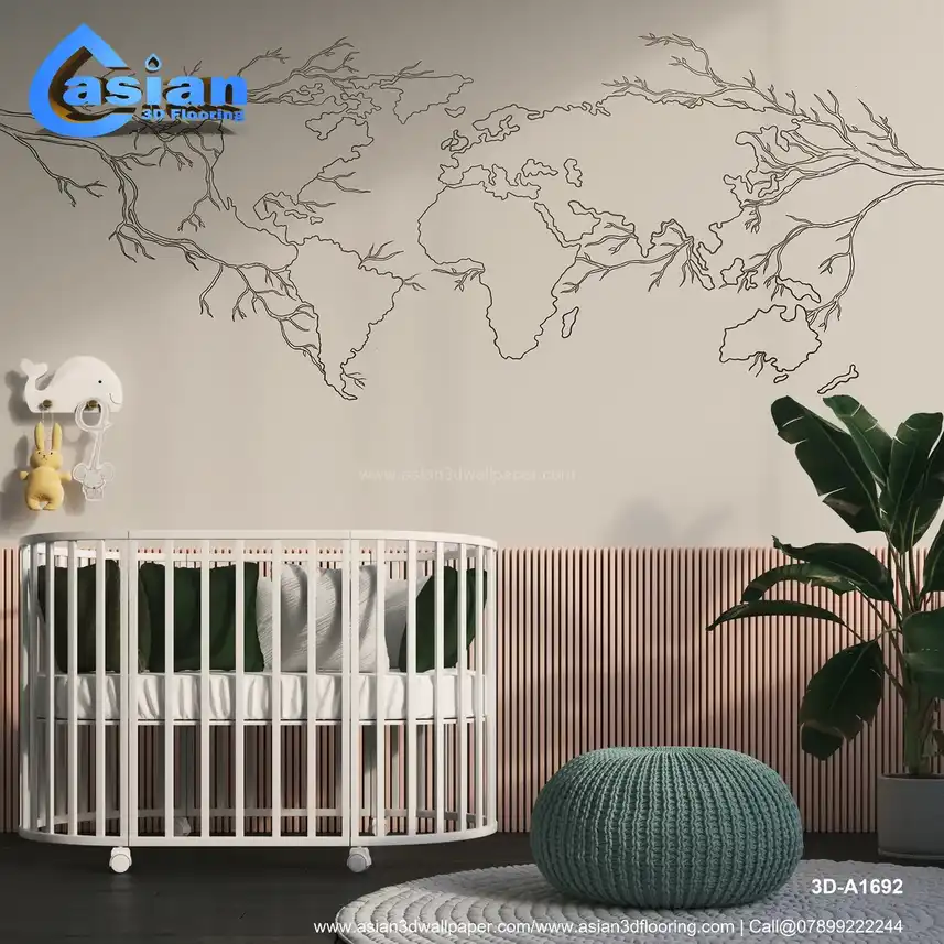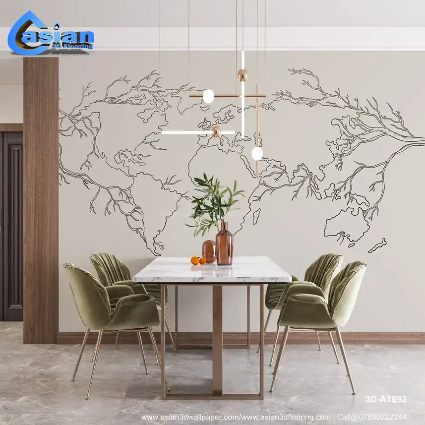 A unique world map design featuring intricate tree branches flowing from the continents. This wallpaper blends nature and geography, adding an artistic touch to any room. Benefits:- This artistic map with tree branches creates a perfect balance of geography and nature, ideal for eco-friendly or minimalist-themed spaces.