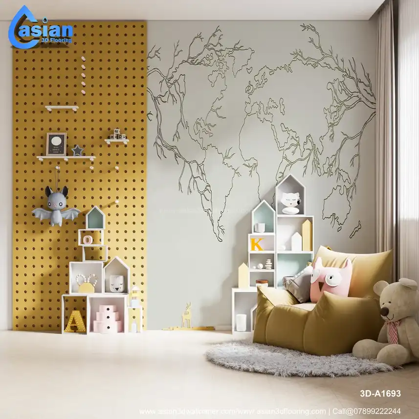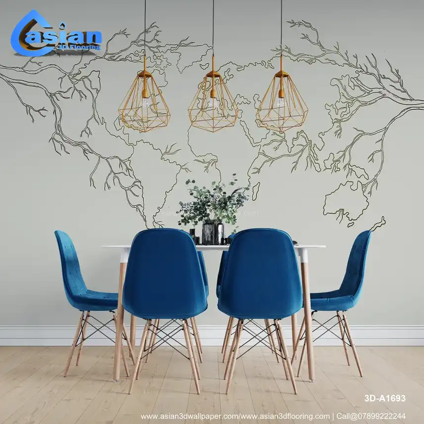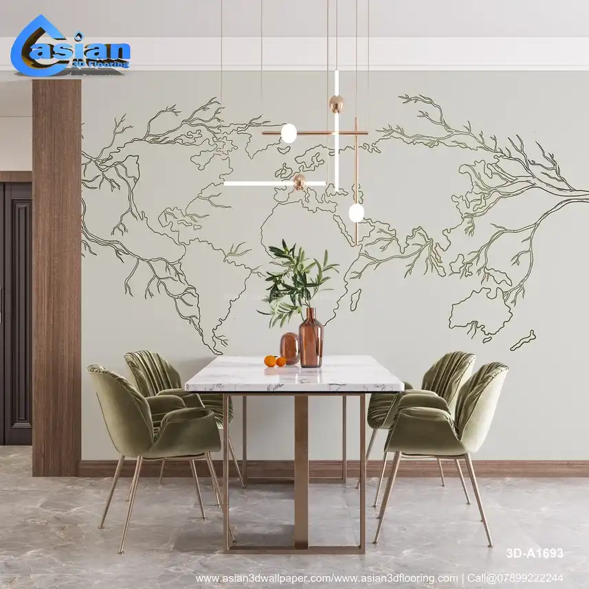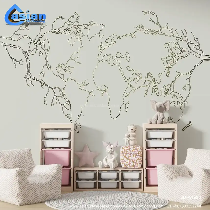 A unique world map design featuring intricate tree branches flowing from the continents. This wallpaper blends nature and geography, adding an artistic touch to any room. Benefits:- This artistic map with tree branches creates a perfect balance of geography and nature, ideal for eco-friendly or minimalist-themed spaces.