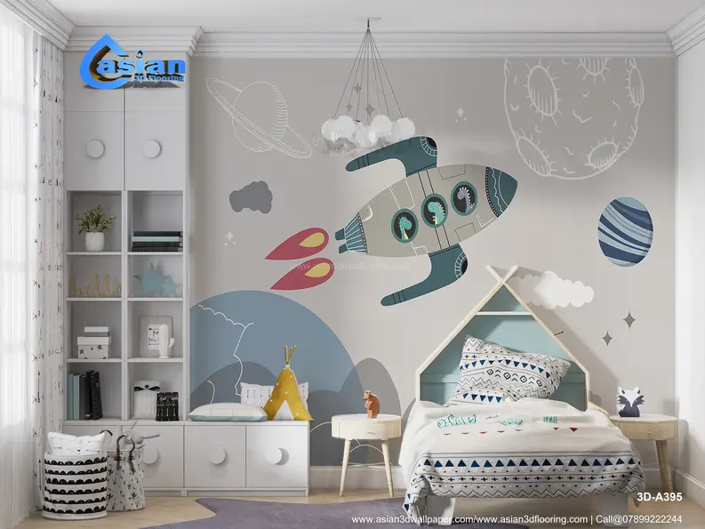 Spark your child?s imagination with this playful 3D wallpaper featuring a fun space adventure theme. Cute dinosaurs in rocket ships flying through the stars and planets create a fun and adventurous atmosphere, perfect for a child?s bedroom or play area. The soft color palette of greys, blues, and muted reds adds a calming yet exciting element to any space. Ideal for sparking creativity and curiosity in young minds. Product Benefits :- Enhances creativity and curiosity in children. Perfect for nurseries, kids' rooms, and play spaces with a space adventure theme.