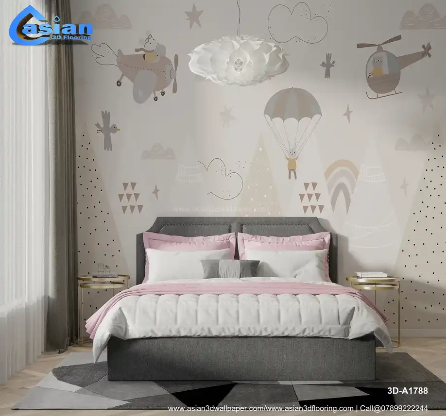 This delightful wallpaper brings a whimsical adventure to life with charming animals in airplanes, parachutes, and helicopters, soaring over a dreamy mountain landscape. Soft pastel tones make it a calming addition to nurseries or kids' rooms, fostering creativity and imagination. The playful design appeals to young adventurers, making it perfect for a nursery, playroom, or kids' bedroom decor. Benefits:- Inspires imagination, calming colors, cute design for kids