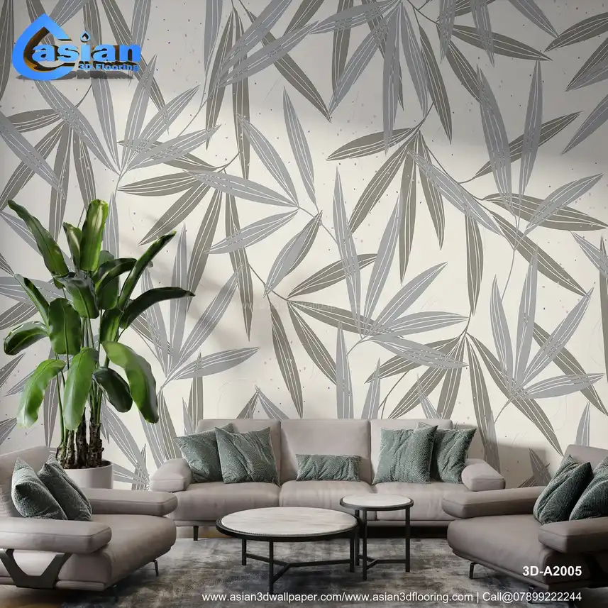 Bamboo Leaf Wallpaper, Cream Background with Grey and Pink Leaves||3D-A2005