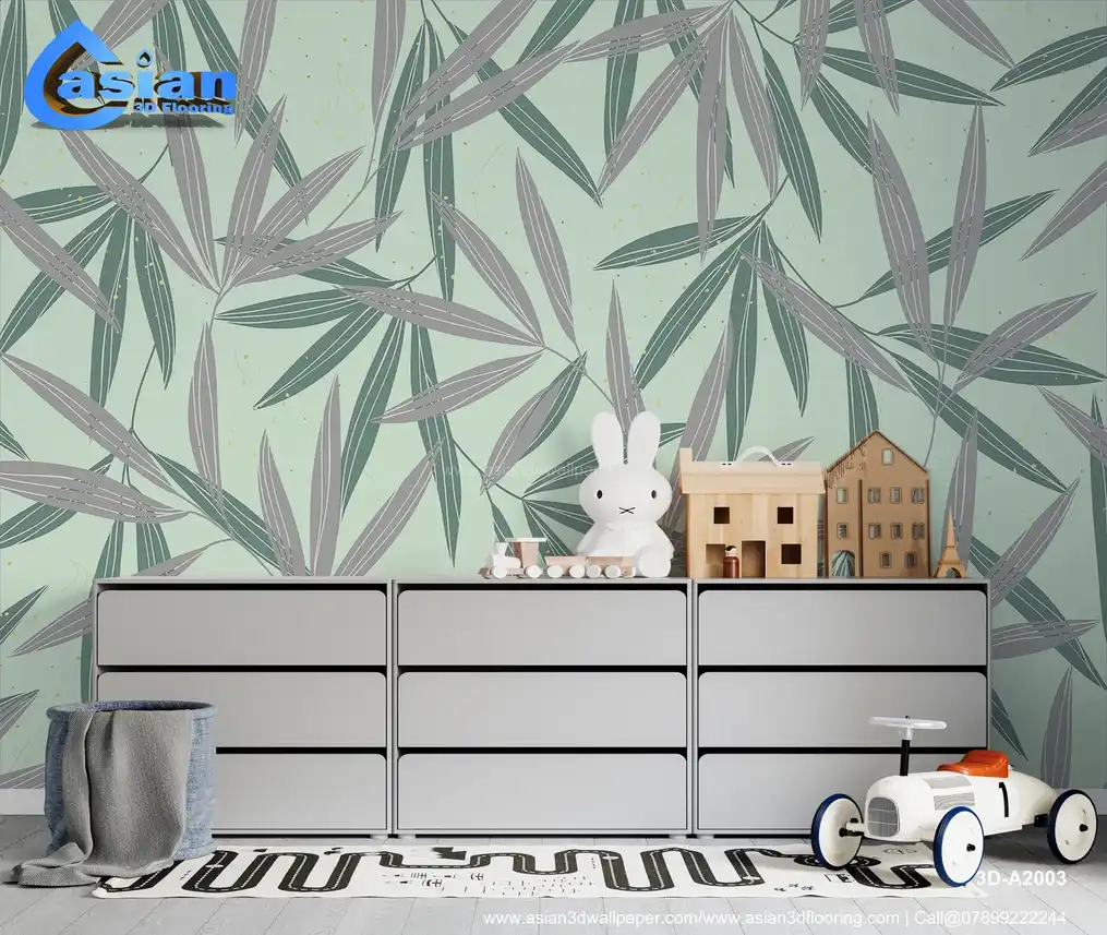Bamboo Leaf Wallpaper, Green and Grey Leaves, Abstract Botanical Design||3D-A2003