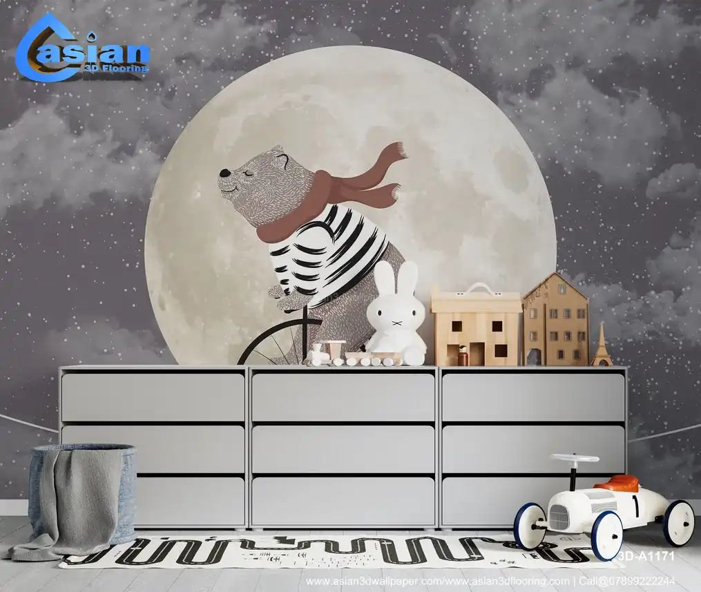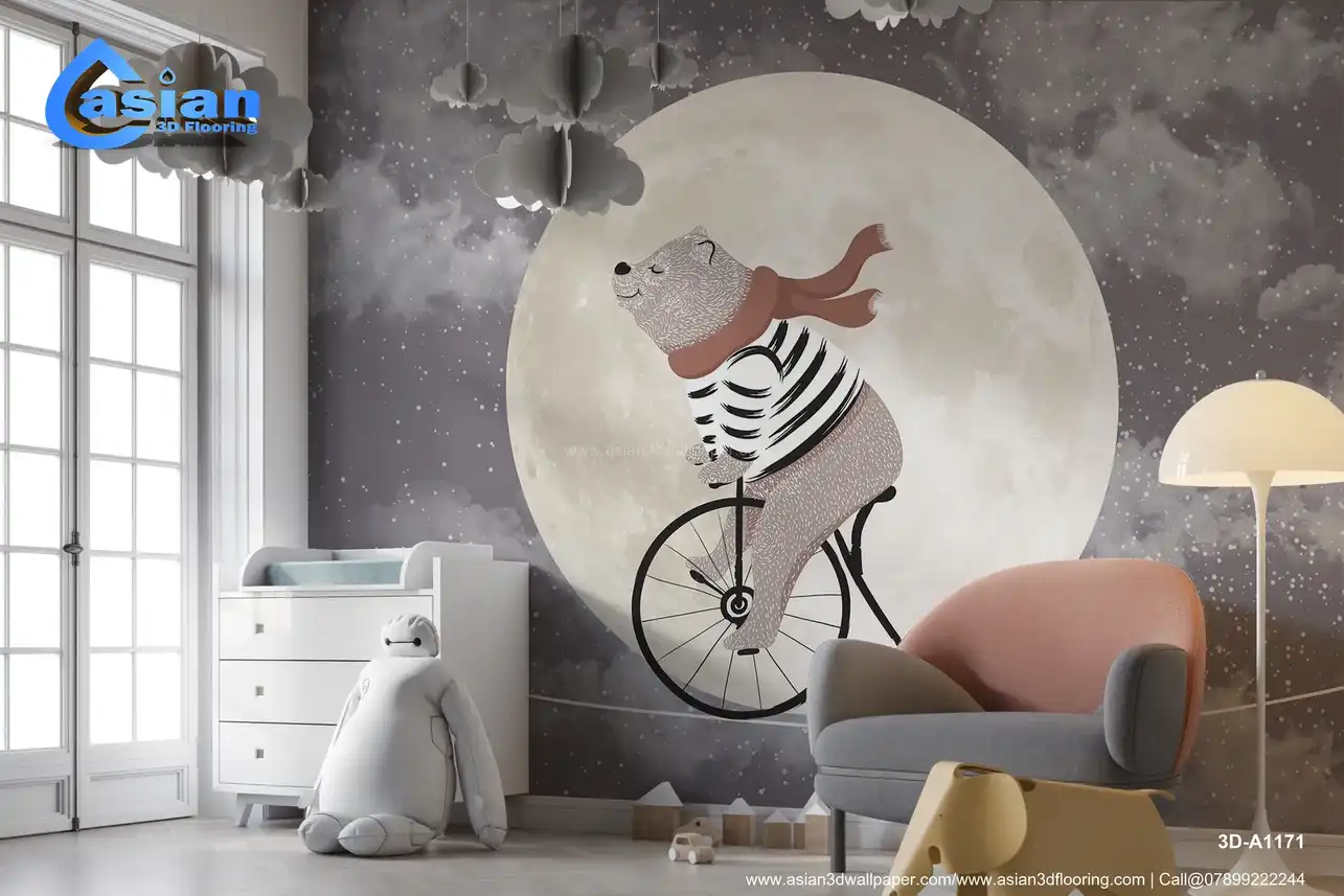 Bring a touch of whimsy to your child's room with our Bear Riding Bicycle Wallpaper. This enchanting design features a charming bear pedaling a bicycle under the bright moon, surrounded by soft clouds and a gentle snowfall. Perfect for nurseries, playrooms, or children's bedrooms, this wallpaper encourages imagination and adventure. Crafted with eco-friendly materials, it ensures a safe and delightful atmosphere for your little ones. Transform their space into a magical world of fun and creativity! Benefits:- Foster a sense of adventure and whimsy in your child's room with our Bear Riding Bicycle Wallpaper, inspiring creativity and joyful dreams.