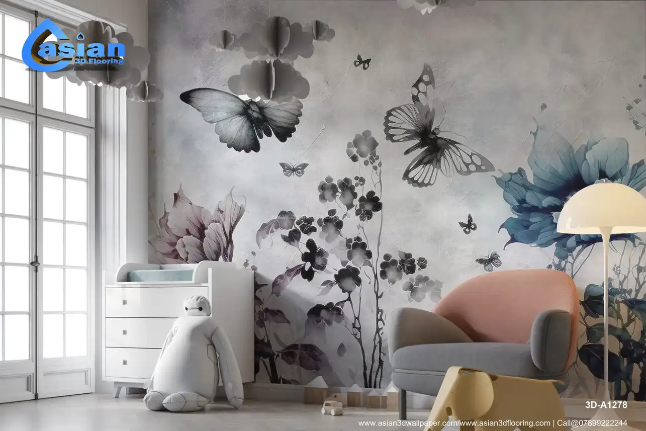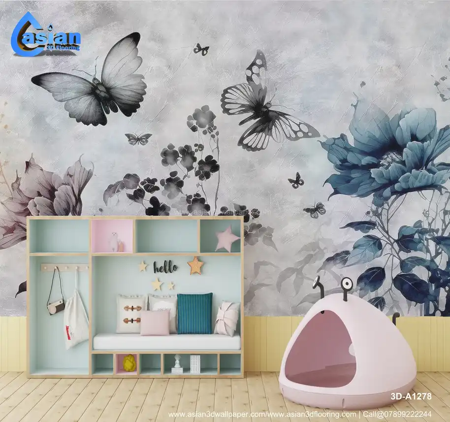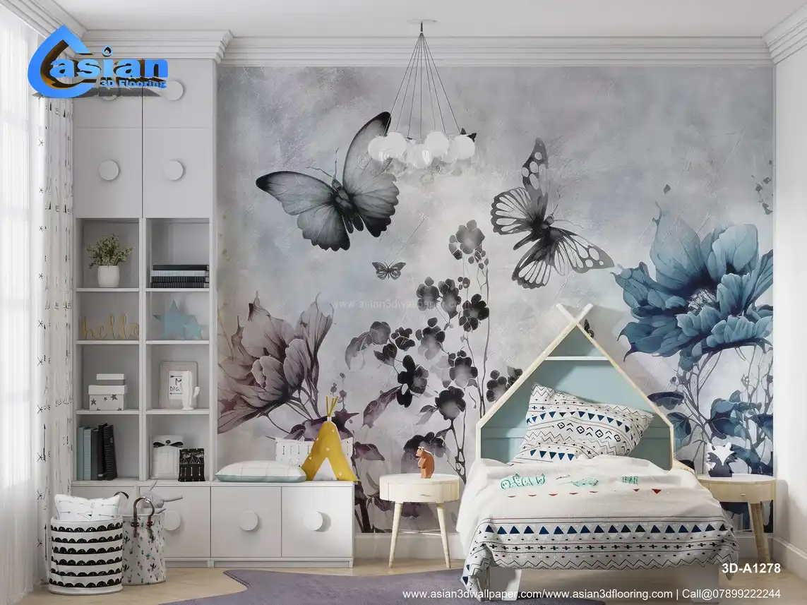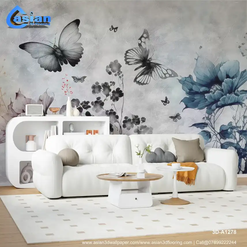 Create a serene and enchanting atmosphere with this butterfly and flower wallpaper design. Featuring delicate butterflies fluttering around soft blue and black flowers, this wallpaper captures the elegance of nature with a dreamy and artistic touch. The subtle gradients of blues and blacks create a calming vibe, making it perfect for bedrooms, living rooms, or any space that benefits from a peaceful yet captivating ambiance. The fine details and soft pastel tones add a sophisticated and modern touch to any room. Benefits:- This wallpaper combines delicate butterflies and soft flowers to create a peaceful, nature-inspired design perfect for any modern or vintage-styled room.