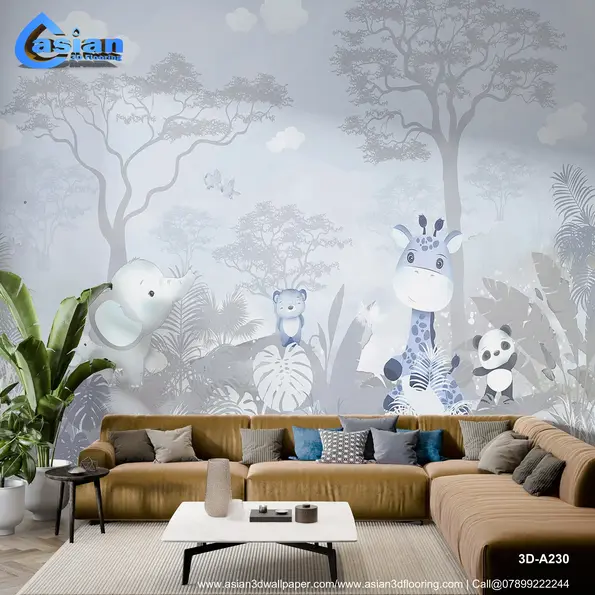 This charming 3D wallpaper in soft blue hues creates a cool, calming atmosphere in any child's room. Featuring adorable elephants, giraffes, pandas, and other safari animals, it brings the beauty of nature to life in a playful way. The gentle colors and whimsical design make it ideal for nurseries, playrooms, or any creative space. Perfect for encouraging imagination and creating a cozy, adventurous environment for young explorers. Product Benefits :- Creates a soothing and playful atmosphere for children's rooms, perfect for sparking imagination.