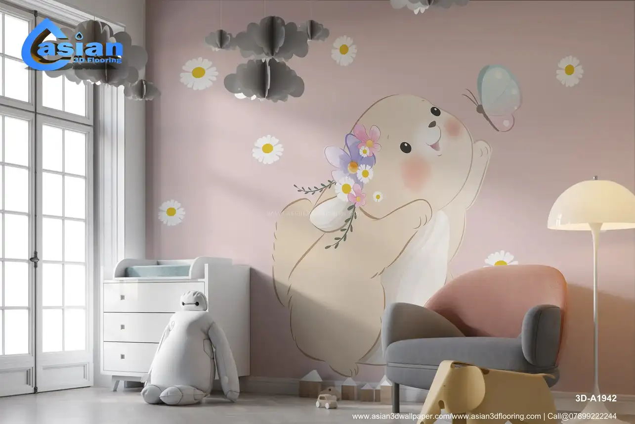 Cute Bunny with Flowers and Butterfly Wallpaper for Kids||3D-A1942
