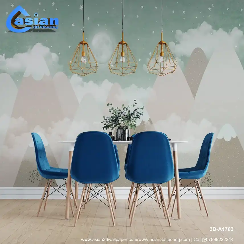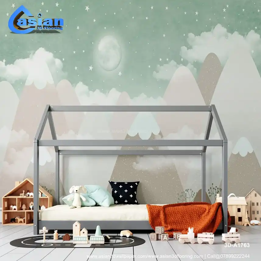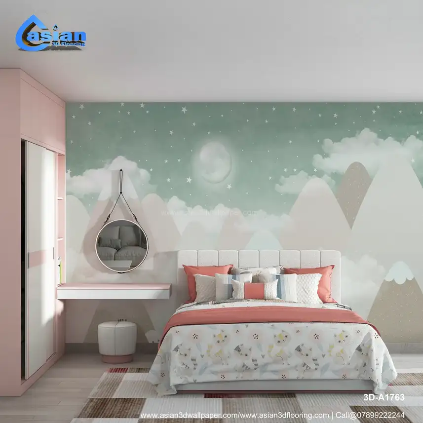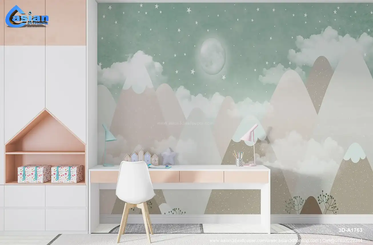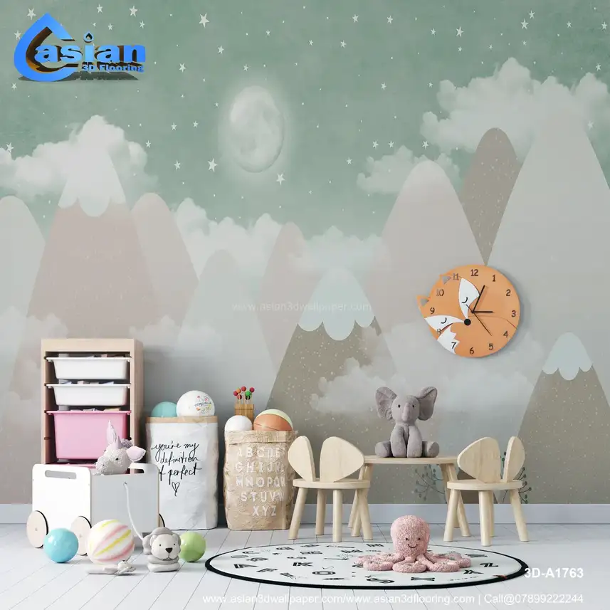 Bring a serene, magical night into any room with this pastel green mountain wallpaper. Featuring soft green and beige mountains under a starlit sky with clouds and a glowing moon, it?s perfect for nurseries, kids' rooms, or calm spaces looking for a touch of whimsy and tranquility. Benefits:- Creates a tranquil, magical atmosphere; perfect for bedtime; high-quality, safe materials