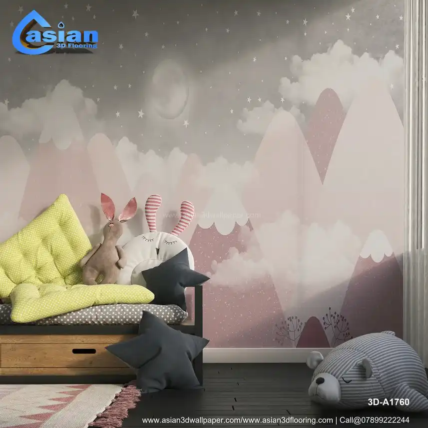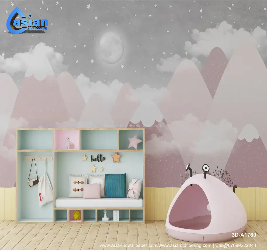 Create a serene and dreamy atmosphere with this pastel mountain night wallpaper. Soft, muted pinks and grays form a whimsical mountain landscape under a starlit sky, complete with fluffy clouds and a glowing moon. Ideal for nurseries, bedrooms, or calm spaces. Benefits:- Promotes calmness and relaxation; perfect for bedtime and soothing environments; crafted with high-quality, child-safe materials