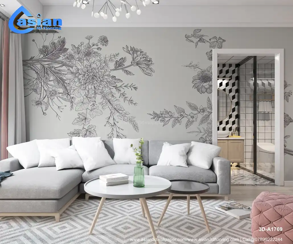 Elegant Floral Line Art on Soft White Wallpaper||3D-A1769