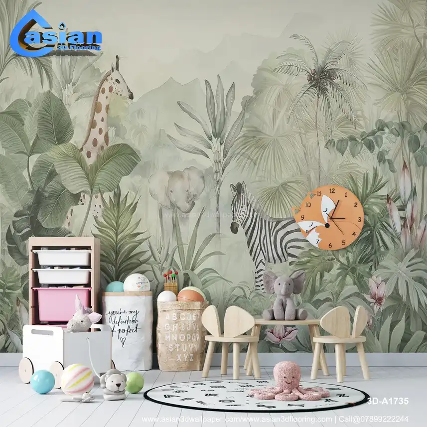 Create an enchanting jungle escape with this safari wallpaper, showcasing animals like giraffes, zebras, and elephants amidst dense, lush greenery. Perfect for adding a serene, nature-inspired vibe to kids' rooms or nurseries. Benefits:- Adds a peaceful, imaginative setting for children; eco-friendly and safe materials; brings the beauty of the jungle indoors, perfect for inspiring young minds