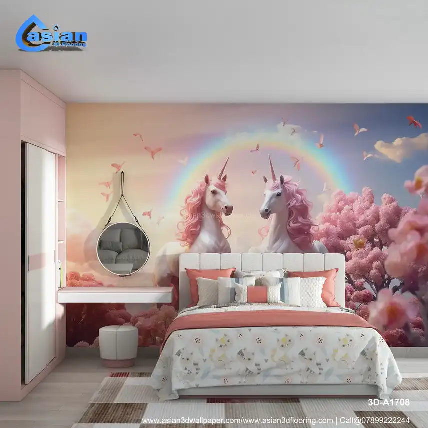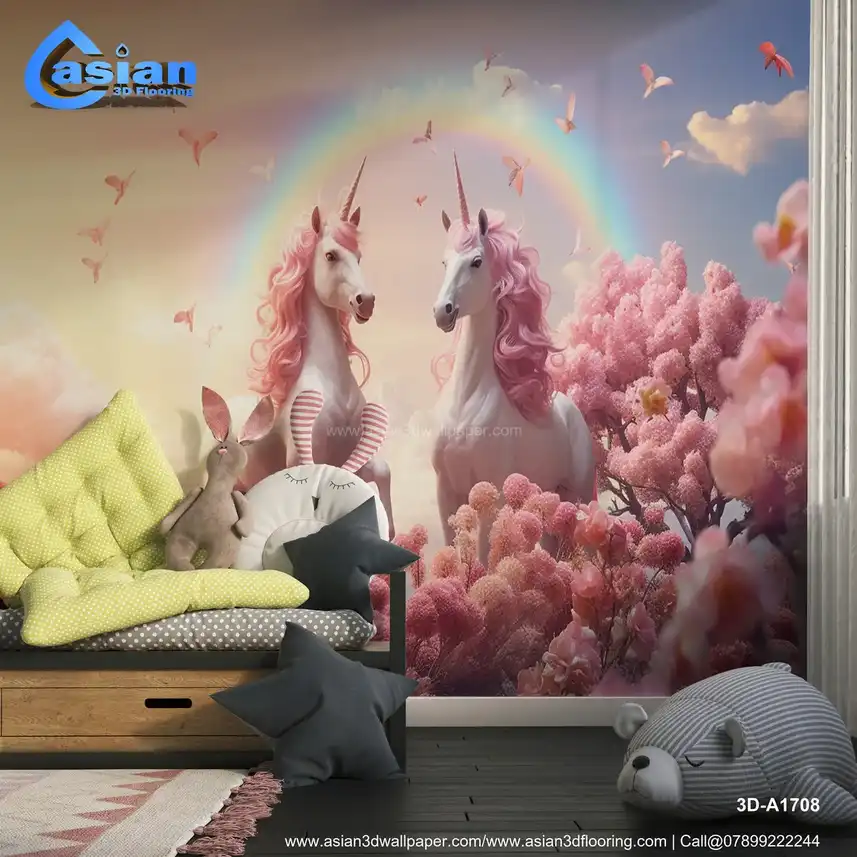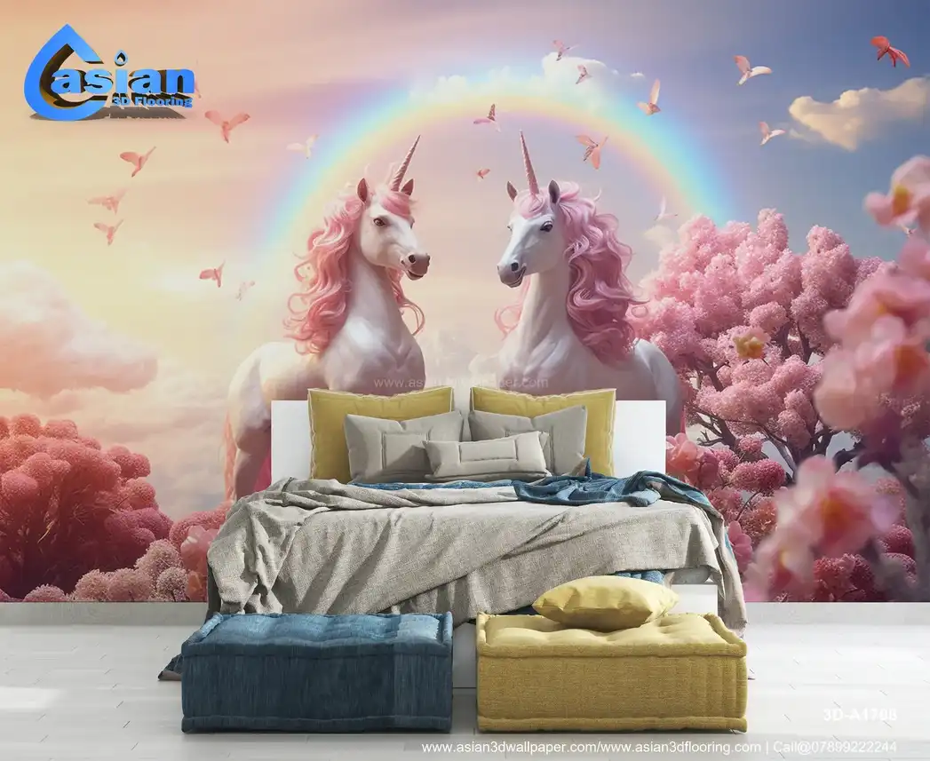 Two magical unicorns stand in a dreamy landscape of pink blossoms, with a rainbow arching across the sky and butterflies fluttering around, creating a whimsical and serene atmosphere for a fantasy-themed space. Benefits:- Create a fantasy-inspired room with two magical unicorns, a rainbow, and a dreamy pink landscape, perfect for adding whimsy and charm to your space.