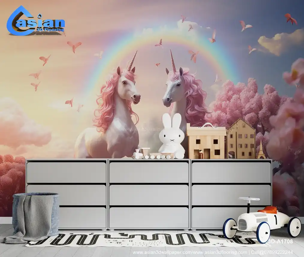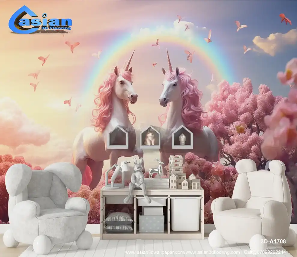 Enchanting Unicorns in a Dreamy Pink Landscape with Rainbow||3D-A1708