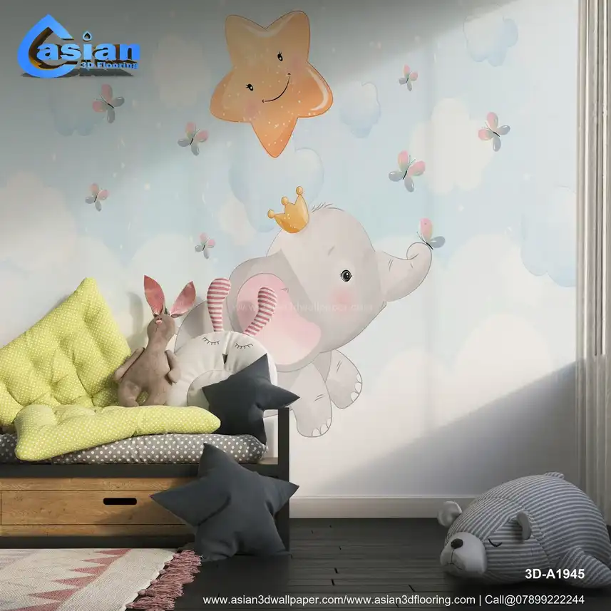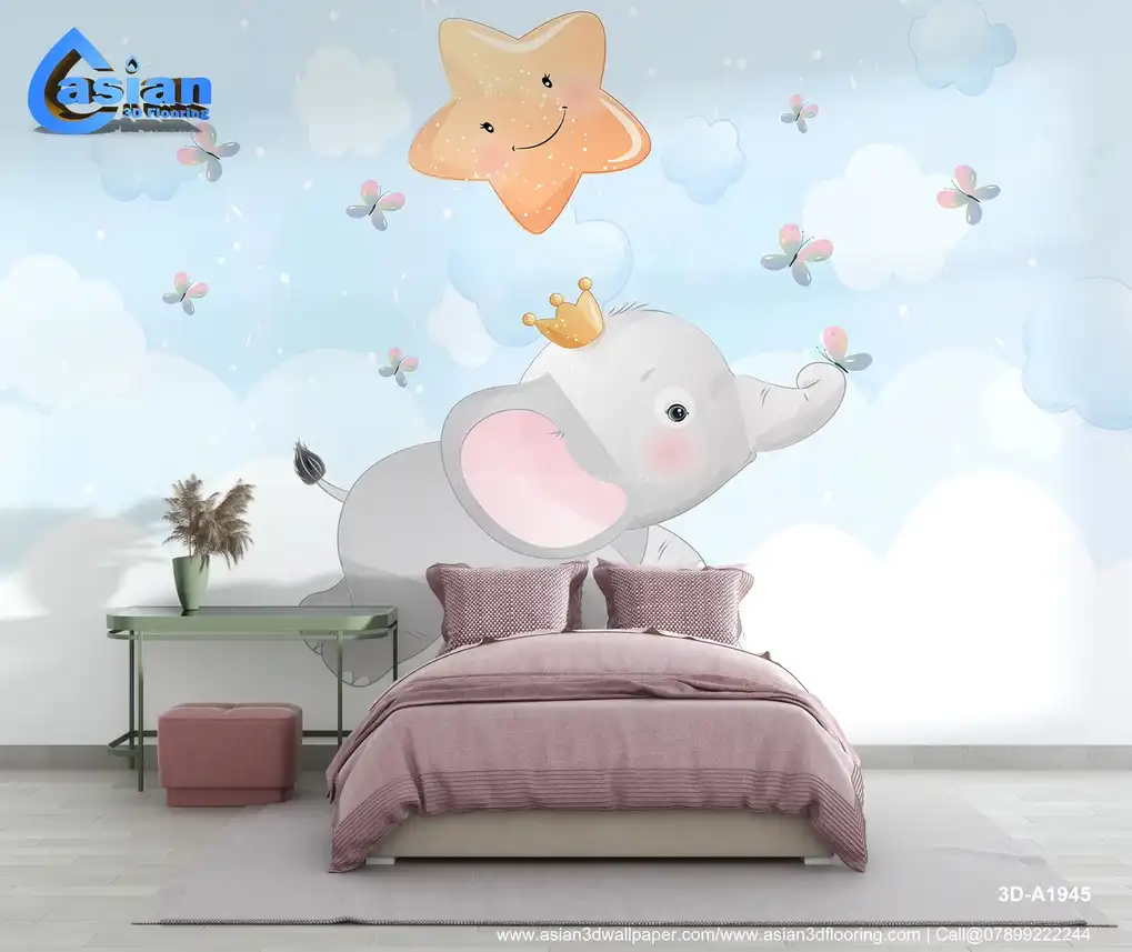 This adorable wallpaper features a playful baby elephant wearing a crown, soaring through the clouds with a smiling star above. Butterflies flutter around as the cheerful design promotes a fun, uplifting atmosphere, making it perfect for nurseries or children's bedrooms. The bright blue sky and pastel hues create a joyful and soothing ambiance. Benefits:- This whimsical wallpaper brings joy and magic to children's spaces with a charming elephant soaring through the clouds, complete with a crown, a star, and playful butterflies.