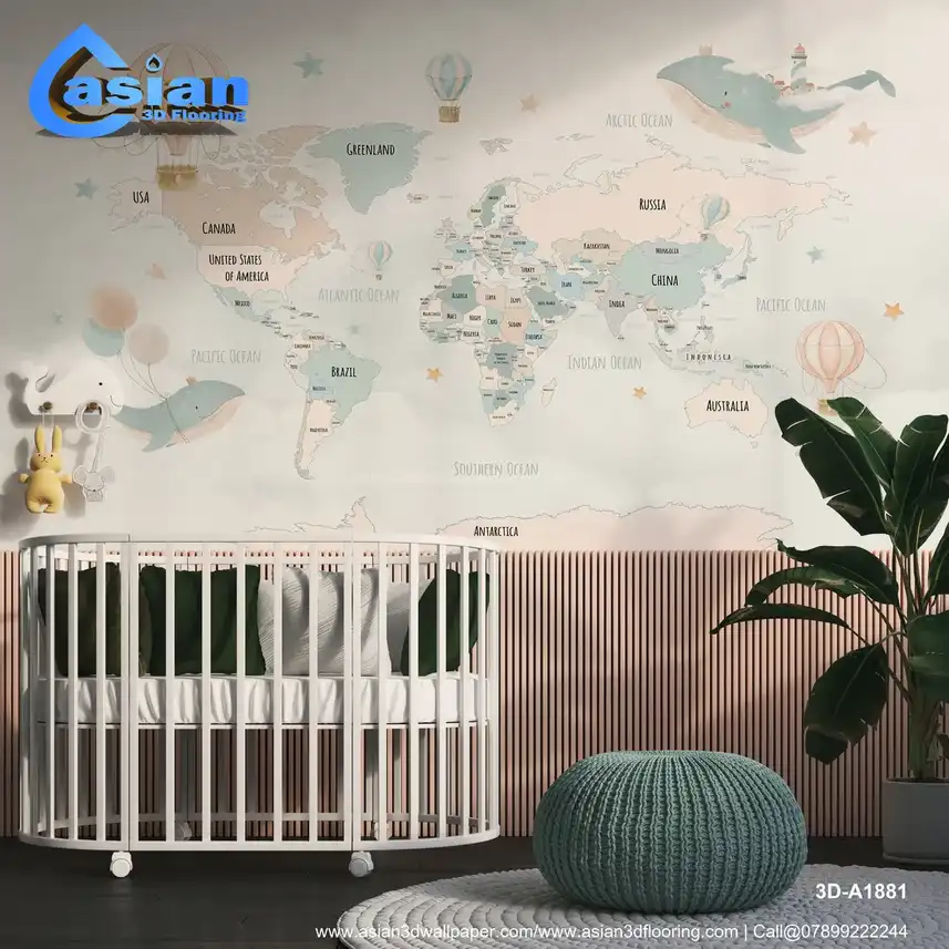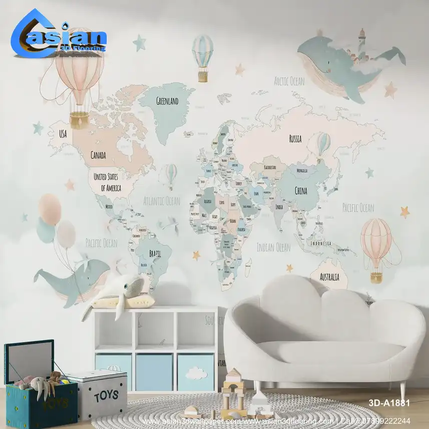 This playful world map wallpaper features soft pastel colors, hot air balloons, and a whale flying through the sky, making it perfect for kids' rooms and nurseries. A fun educational d?cor piece. Benefits:- Bring adventure and learning to life in your child's room with this world map wallpaper featuring pastel hot air balloons, a floating whale, and a fun, imaginative design.
