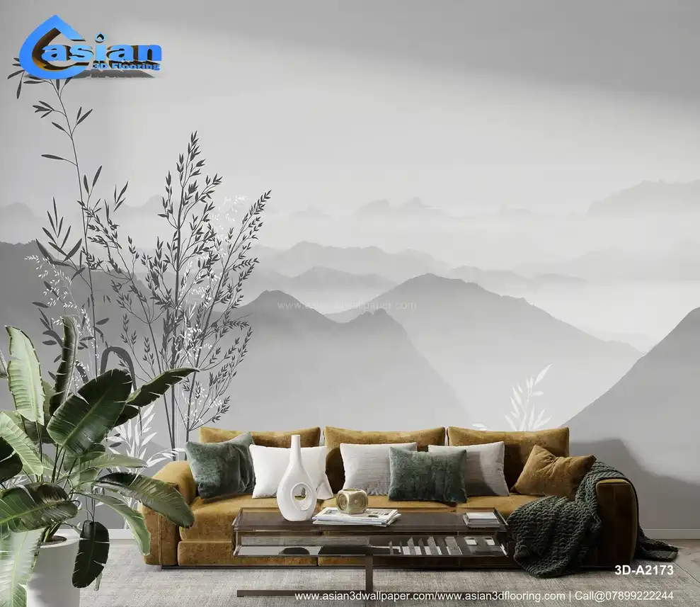 Monochrome Majesty: Misty Mountain Landscape Wall Mural with Botanical Accents||3D-A2173