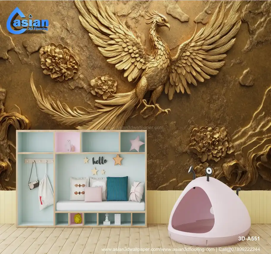 Transform your space into a majestic haven with the "Opulent Golden Phoenix Wallpaper." This wallpaper features a stunning 3D phoenix with intricate feather and floral detailing, all rendered in rich golden tones. The design symbolizes rebirth and prosperity, making it an ideal choice for luxurious settings like living rooms, hotel lobbies, or upscale offices. Made with premium, eco-friendly materials, this wallpaper ensures durability and a visually striking finish that captures and reflects light beautifully. Benefits:- Adds luxury and symbolism, eco-friendly, durable and reflective, enhances light in the room