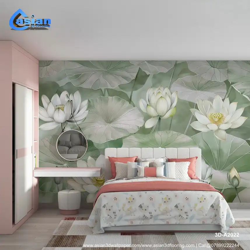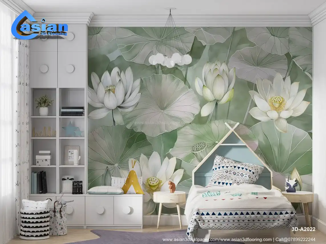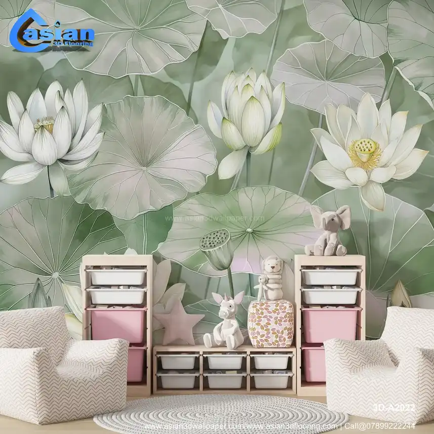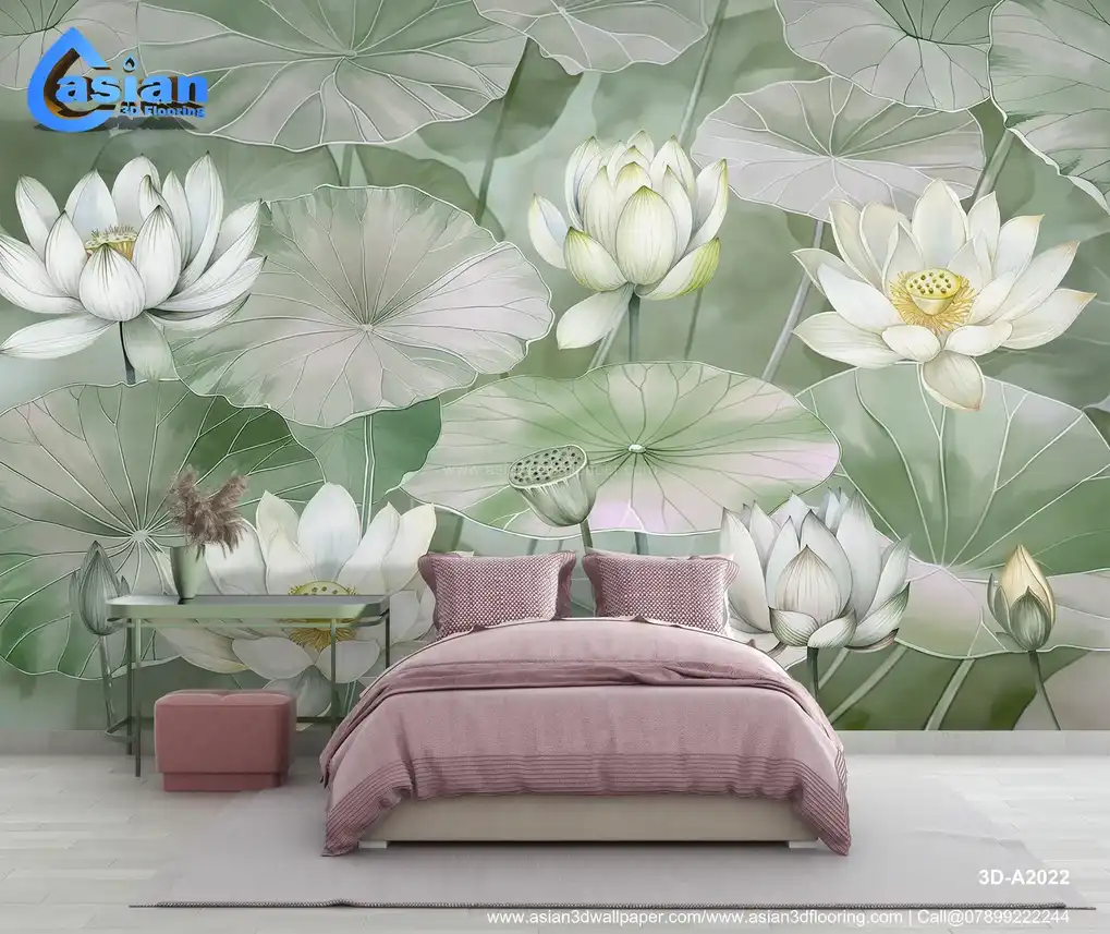 This peaceful lotus flower wallpaper design features delicate white lotus blossoms surrounded by soft green leaves, creating a serene and natural ambiance in your room. Benefits:- Ideal for creating a serene atmosphere in your living space, this wallpaper brings tranquility and elegance to any room.
