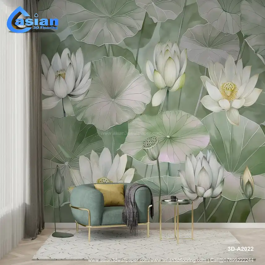 Peaceful Lotus Flower Wallpaper in Soft Green and White||3D-A2022