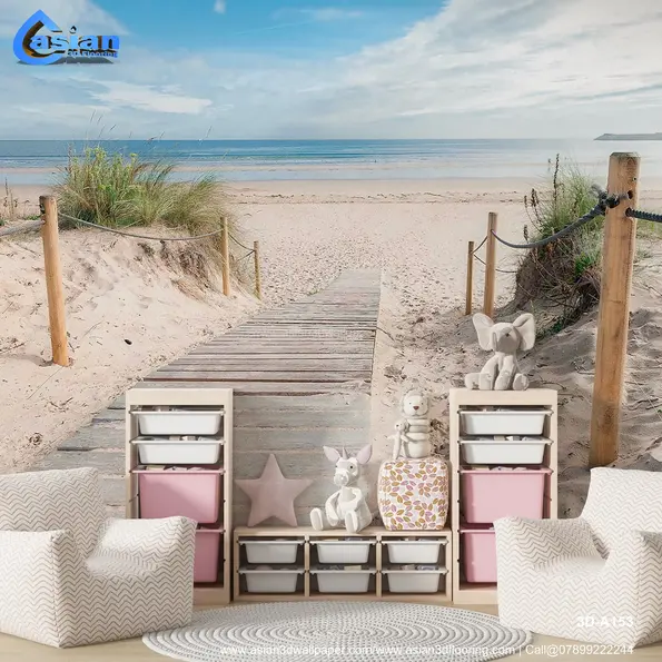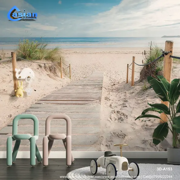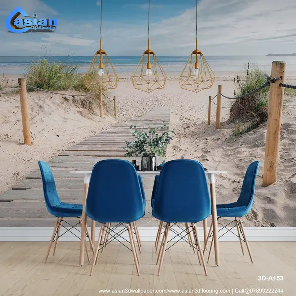 This peaceful beach wallpaper captures a serene wooden walkway leading to a beautiful sandy beach and calm ocean. The clear blue skies, tranquil waters, and soft sand evoke a sense of calm and relaxation, making it perfect for creating a coastal ambiance in bedrooms, living rooms, or offices. Bring the soothing vibes of the coast into your space with this coastal-inspired wallpaper. Product Benefits :- Creates a calming and serene environment with a beautiful beach view, perfect for coastal or nature-inspired d?cor.