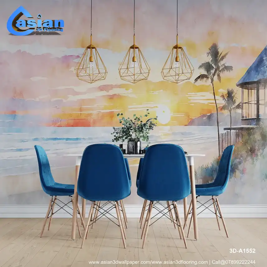 Serene Watercolor Beach Sunset Wallpaper for Tranquil Spaces||3D-A1552