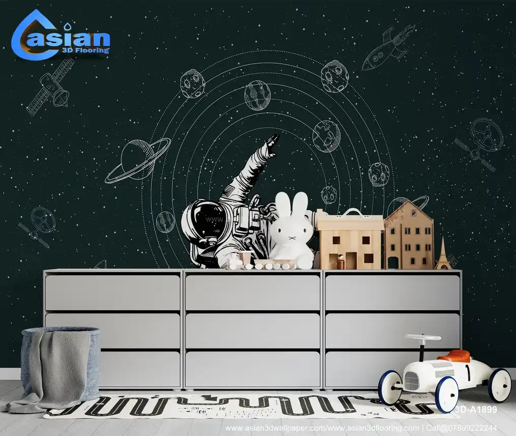 Space Themed Astronaut and Planetary Exploration Wallpaper (Dark Green)||3D-A1899