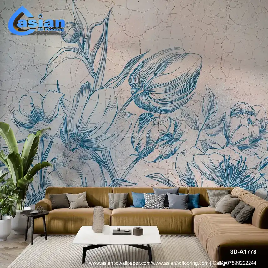 Vintage Blue Floral Line Art Wallpaper||3D-A1778