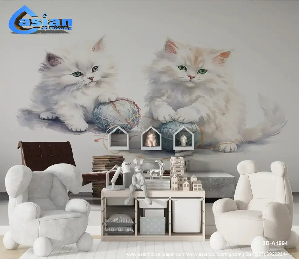 This delightful watercolor wallpaper features two playful kittens with big green eyes, happily playing with yarn balls. Perfect for cat lovers or children's rooms, adding warmth and charm. Benefits:- Add a playful touch to your space with this watercolor kitten wallpaper, perfect for any cat lover.