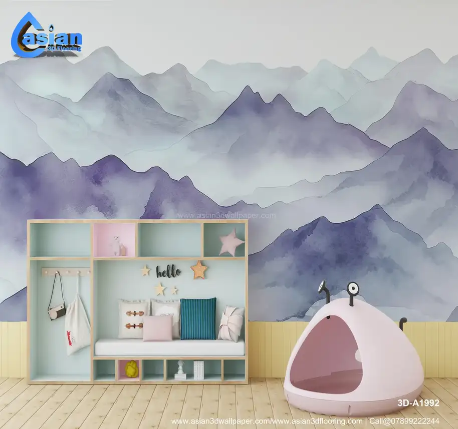 This stunning watercolor wallpaper showcases a misty purple mountain landscape with soft hues of purple, blue, and mist, creating a dreamy, tranquil atmosphere in any room. Benefits:- Bring serenity to your space with a misty watercolor purple mountain landscape, perfect for creating a peaceful ambiance.