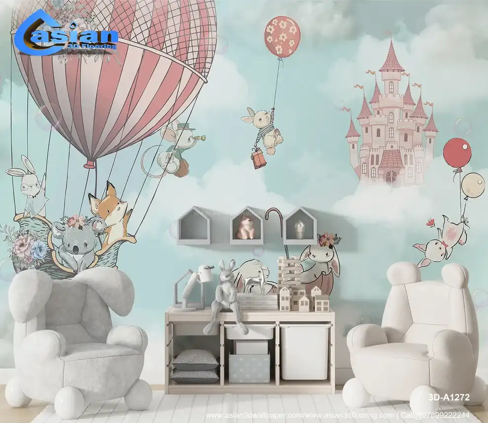 Whimsical Animal Hot Air Balloon Wallpaper for Kids Rooms||3D-A1272