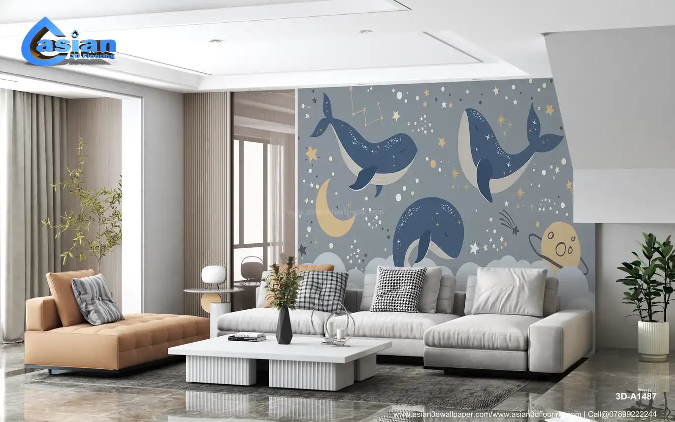 Whimsical Whale Wallpaper with Stars and Clouds||3D-A1487