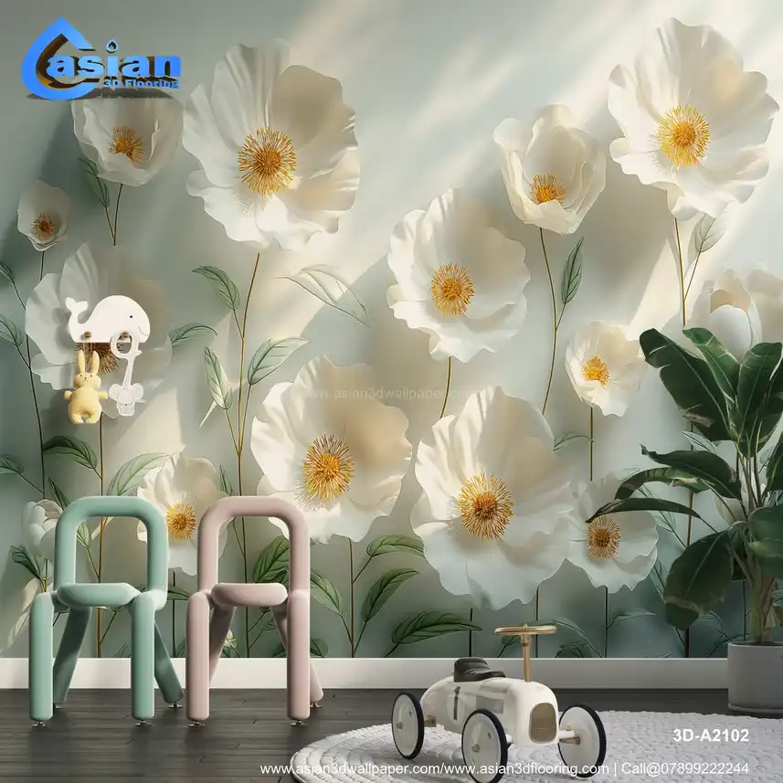 White Flowers with Yellow Centers - Elegant Floral Wallpaper||3D-A2102