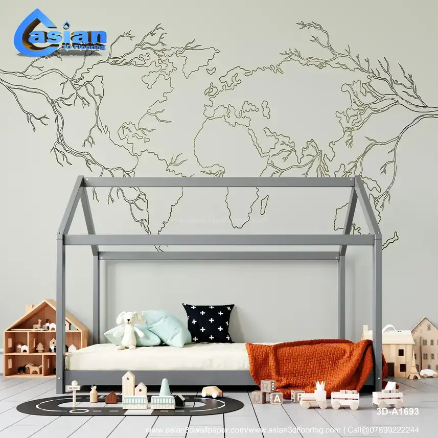 A unique world map design featuring intricate tree branches flowing from the continents. This wallpaper blends nature and geography, adding an artistic touch to any room. Benefits:- This artistic map with tree branches creates a perfect balance of geography and nature, ideal for eco-friendly or minimalist-themed spaces.