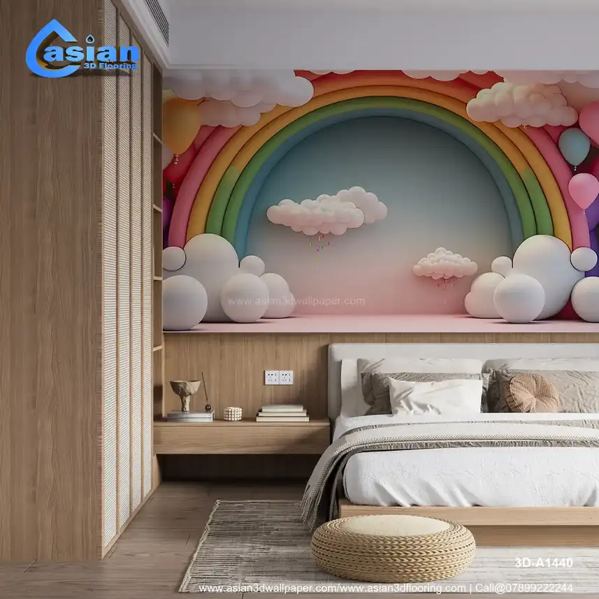 Vibrant Rainbow and Cloud Wall Mural with Balloons for Kids? Room