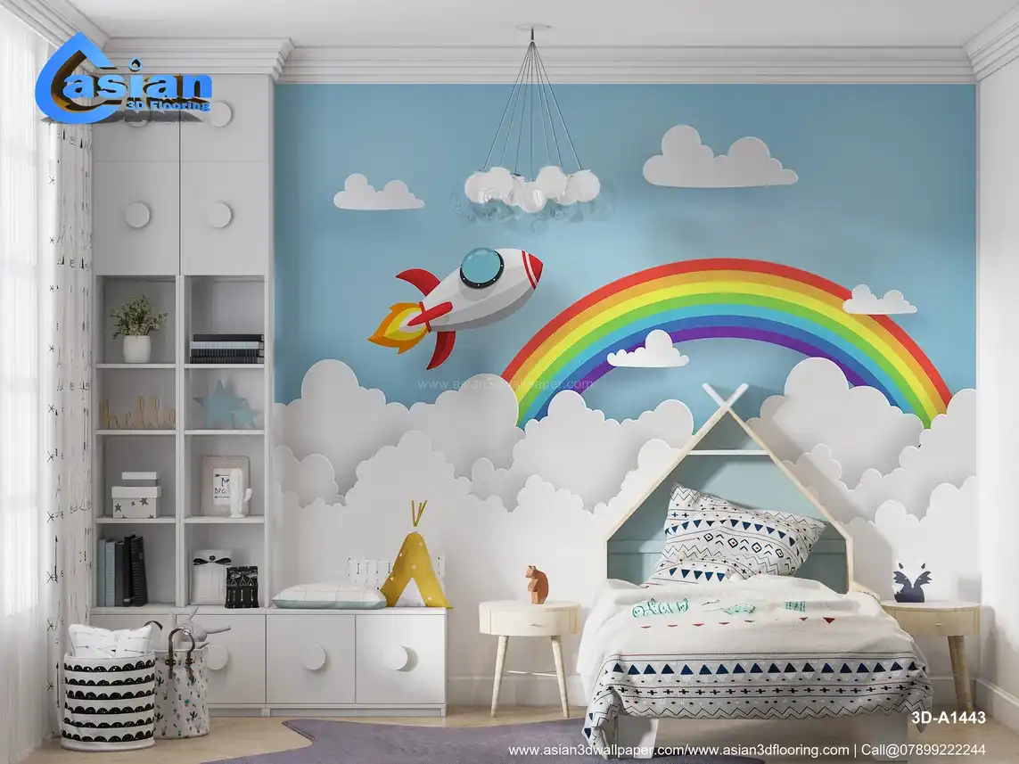 Playful Rocket and Rainbow Wall Mural for Kids' Rooms