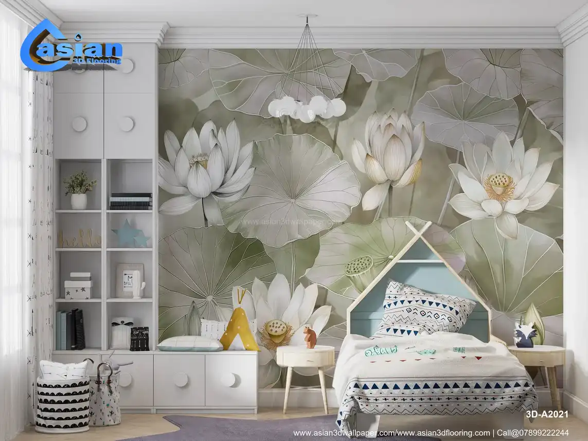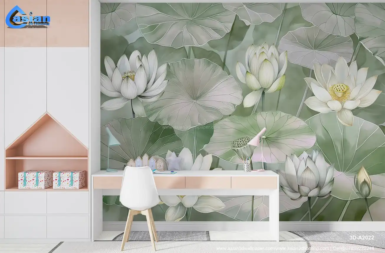 Peaceful Lotus Flower Wallpaper in Soft Green and White